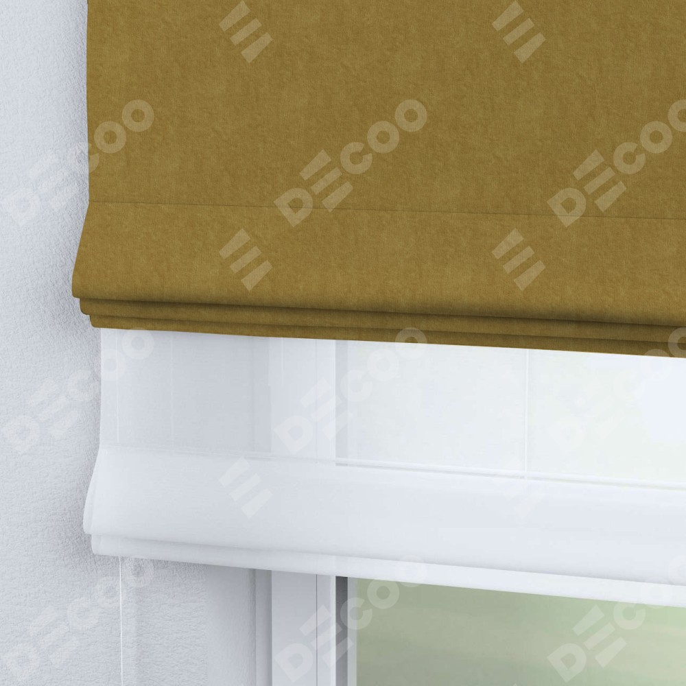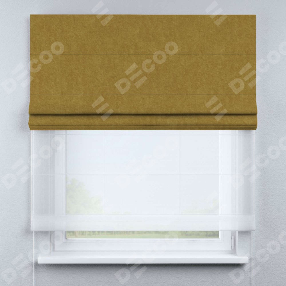 Римская штора день-ночь производителя «Cortin», используется для проёма, пошита из двух полотен, с лицевой стороны канвас горчица артикул v-476, вторая ткань тюль (по стандарту комплектуется тюль белого цвета артикул V-01). Имеет универсальный механизм и подходит для монтажа: на потолок, на стену и в нишу.