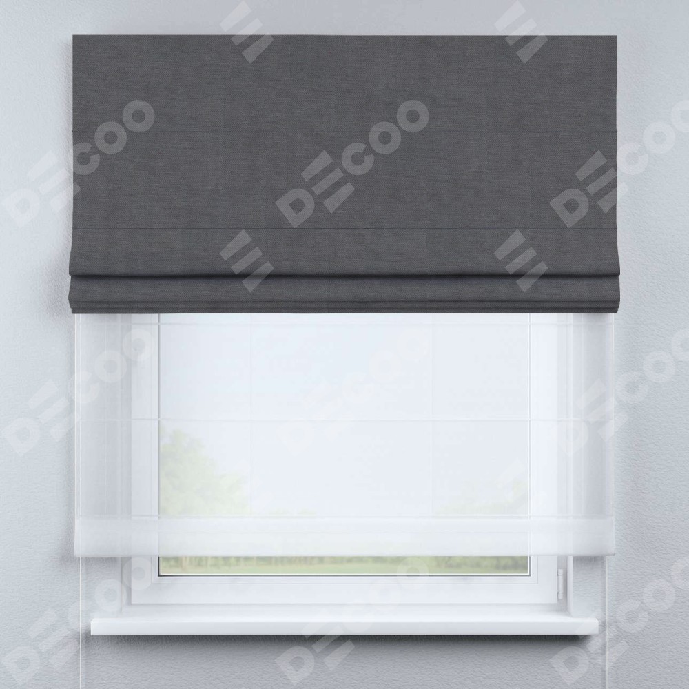 Римская штора день-ночь производителя «Cortin», используется для проёма, пошита из двух полотен, с лицевой стороны канвас мокрый асфальт артикул v-1083, вторая ткань тюль (по стандарту комплектуется тюль белого цвета артикул V-01). Имеет универсальный механизм и подходит для монтажа: на потолок, на стену и в нишу.
