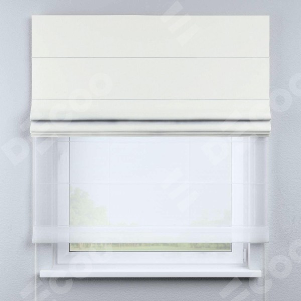 Римская штора день-ночь производителя «Cortin», используется для проёма, пошита из двух полотен, с лицевой стороны канвас молочный артикул v-93, вторая ткань тюль (по стандарту комплектуется тюль белого цвета артикул V-01). Имеет универсальный механизм и подходит для монтажа: на потолок, на стену и в нишу.