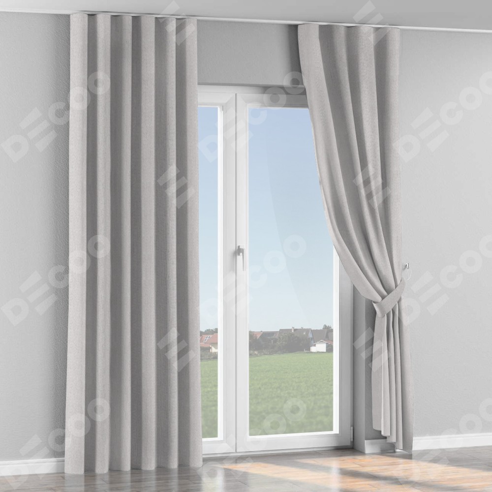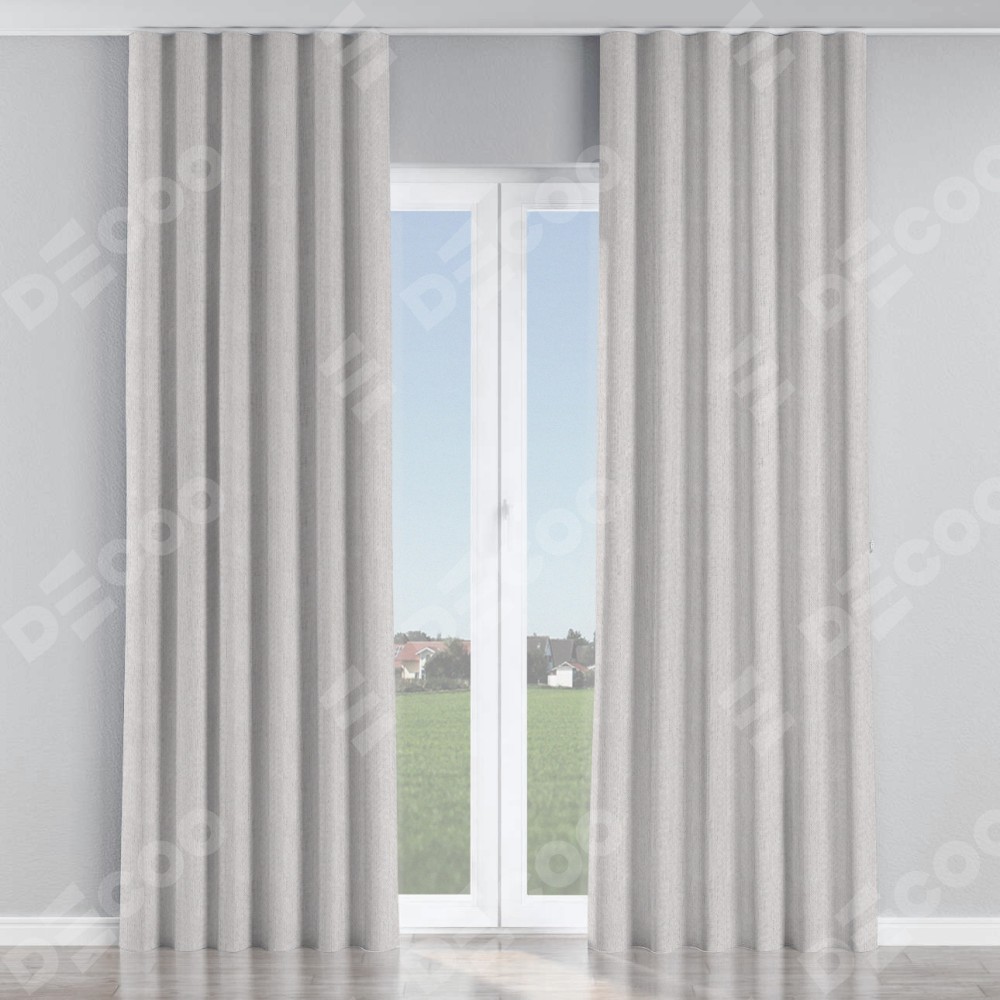 Комплект прямых штор, от производителя «Cortin», пошиты из ткани лён димаут светло-бежевый, артикул ткани 90993. С изнаночной стороны в верхней части штор пристрачивается шторная лента с декоративными складками «Волна». Для создания элегантных складок прямые шторы шьются по стандарту с коэффициентом 1:2 (на 100 см. ширины проёма 200 см. ширины ткани).