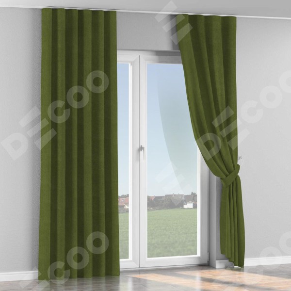 Комплект прямых штор, от производителя «Cortin», пошиты из ткани лён димаут салатовый, артикул ткани 91002. С изнаночной стороны в верхней части штор пристрачивается шторная лента с декоративными складками «Волна». Для создания элегантных складок прямые шторы шьются по стандарту с коэффициентом 1:2 (на 100 см. ширины проёма 200 см. ширины ткани).