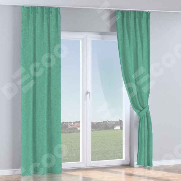 Комплект прямых штор, от производителя «Cortin», пошиты из ткани лён светло-бирюзовый, артикул ткани 53435. С изнаночной стороны в верхней части штор пристрачивается шторная лента с декоративными складками «Кустик». Для создания элегантных складок прямые шторы шьются по стандарту с коэффициентом 1:2 (на 100 см. ширины проёма 200 см. ширины ткани).