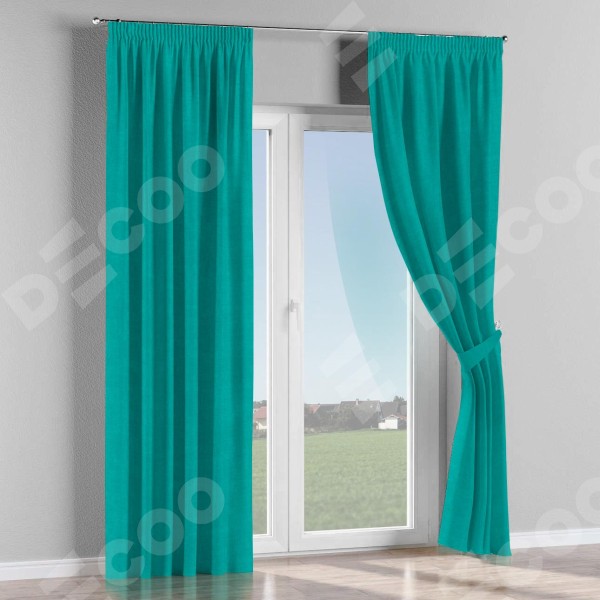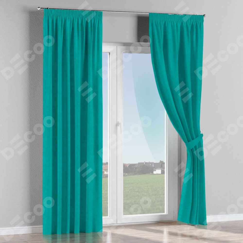 Комплект прямых штор, от производителя «Cortin», пошиты из ткани канвас бирюзовый, артикул ткани v-1048. С изнаночной стороны в верхней части штор пристрачивается шторная лента с декоративными складками «Карандаш». Для создания элегантных складок прямые шторы шьются по стандарту с коэффициентом 1:2 (на 100 см. ширины проёма 200 см. ширины ткани).