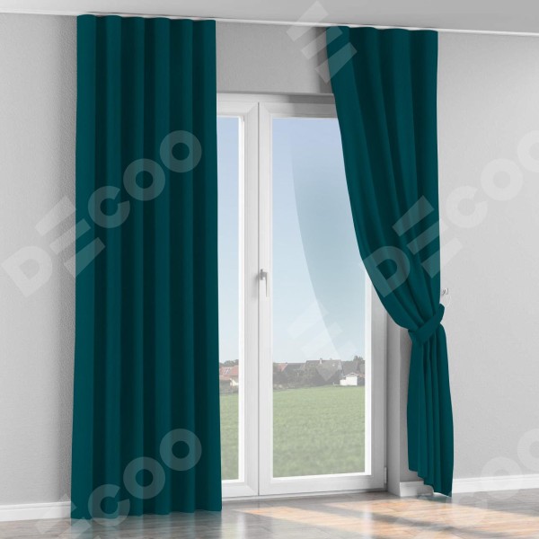 Комплект прямых штор, от производителя «Cortin», пошиты из ткани канвас изумрудный, артикул ткани v-12487. С изнаночной стороны в верхней части штор пристрачивается шторная лента с декоративными складками «Волна». Для создания элегантных складок прямые шторы шьются по стандарту с коэффициентом 1:2 (на 100 см. ширины проёма 200 см. ширины ткани).