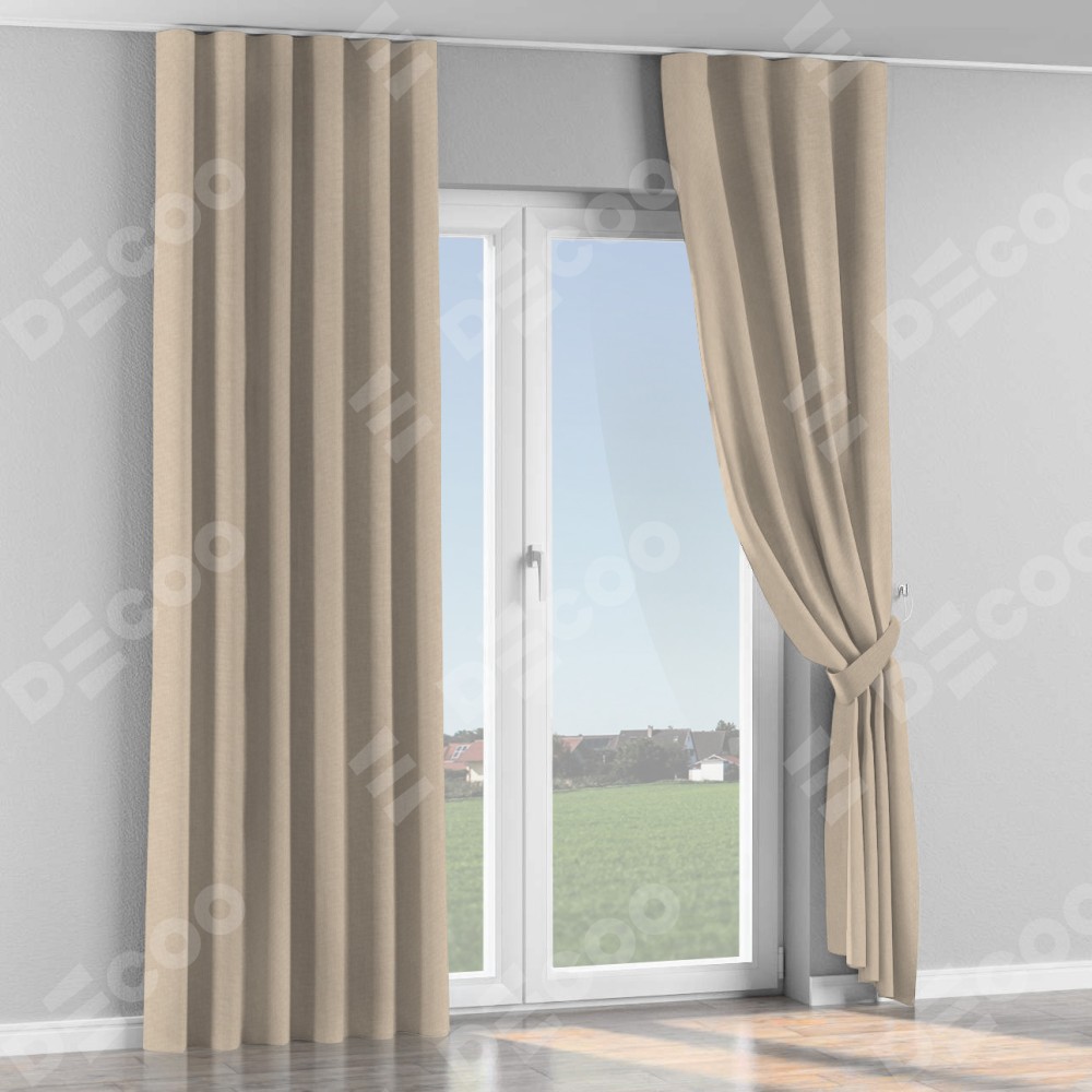Комплект прямых штор, от производителя «Cortin», пошиты из ткани канвас кофе с молоком, артикул ткани v-07. С изнаночной стороны в верхней части штор пристрачивается шторная лента с декоративными складками «Волна». Для создания элегантных складок прямые шторы шьются по стандарту с коэффициентом 1:2 (на 100 см. ширины проёма 200 см. ширины ткани).