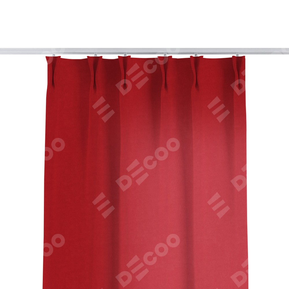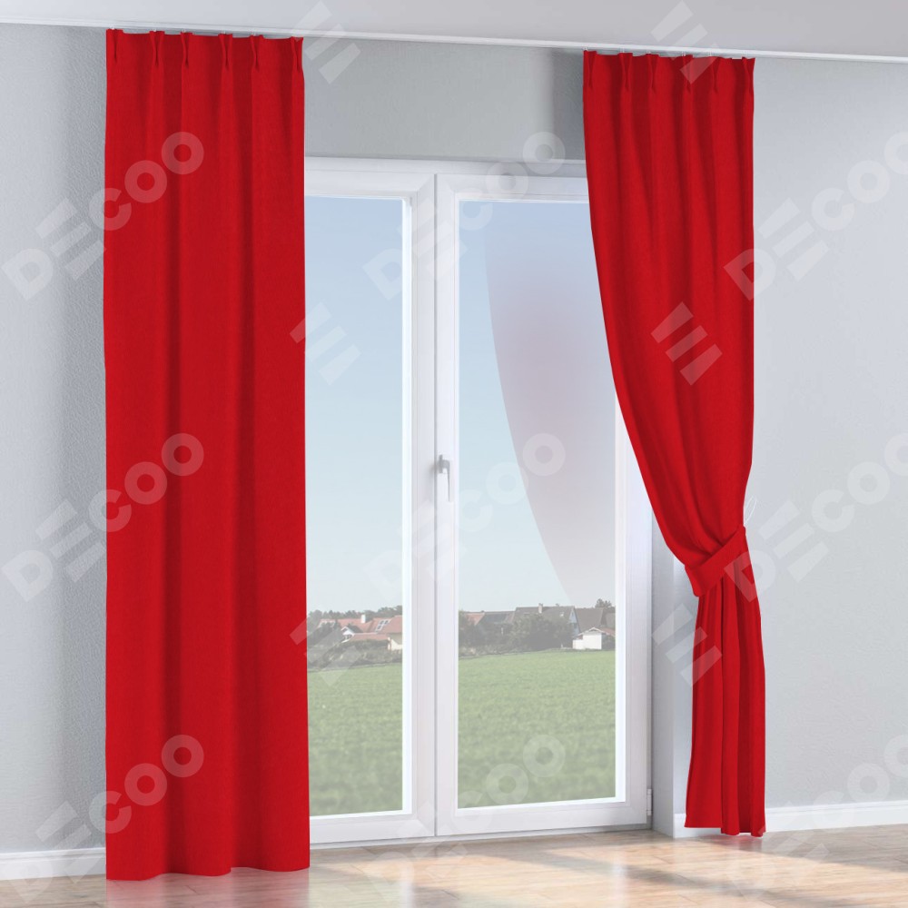 Комплект прямых штор, от производителя «Cortin», пошиты из ткани канвас красный, артикул ткани v-113. С изнаночной стороны в верхней части штор пристрачивается шторная лента с декоративными складками «Кустик». Для создания элегантных складок прямые шторы шьются по стандарту с коэффициентом 1:2 (на 100 см. ширины проёма 200 см. ширины ткани).