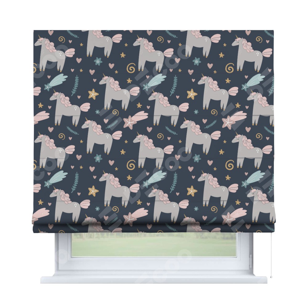 Римская штора производителя «Cortin», используется для проёма, пошита из ткани блэкаут с нанесением сублимационной печати «Милые единороги». Имеет универсальный механизм и подходит для монтажа: на потолок, на стену и в нишу.