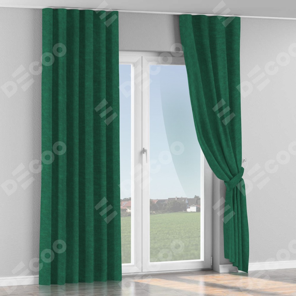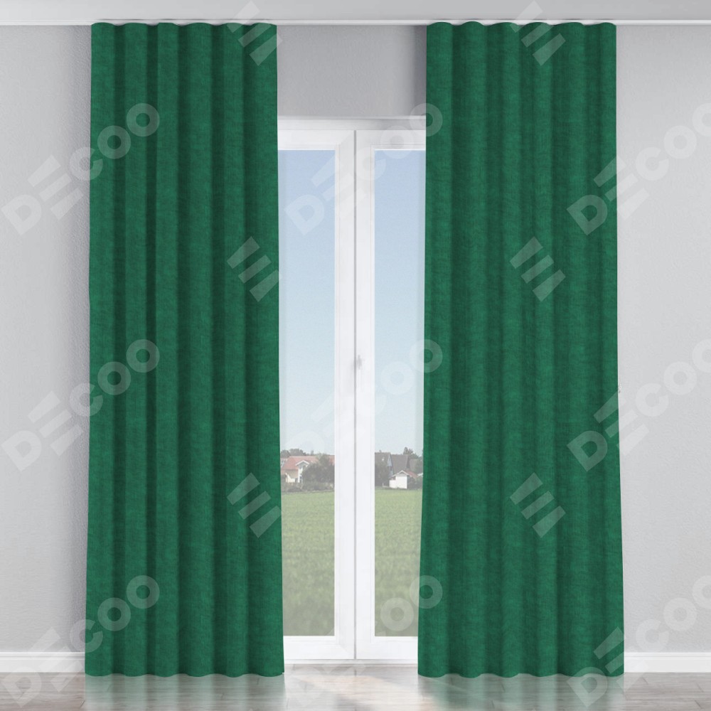 Комплект прямых штор, от производителя «Cortin», пошиты из ткани канвас тёмно-зелёный, артикул ткани v-469. С изнаночной стороны в верхней части штор пристрачивается шторная лента с декоративными складками «Волна». Для создания элегантных складок прямые шторы шьются по стандарту с коэффициентом 1:2 (на 100 см. ширины проёма 200 см. ширины ткани).