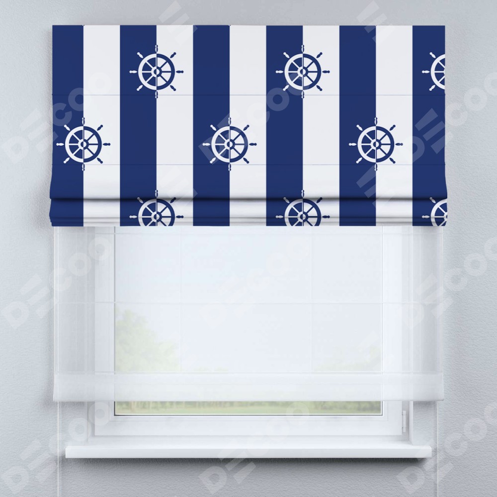 Римская штора день-ночь производителя «Cortin», используется для проёма, пошита из двух полотен, с лицевой блэкаут с нанесением сублимационной печати «Полоски и штурвалы», вторая ткань тюль (по стандарту комплектуется тюль белого цвета артикул V-01). Имеет универсальный механизм и подходит для монтажа: на потолок, на стену и в нишу.