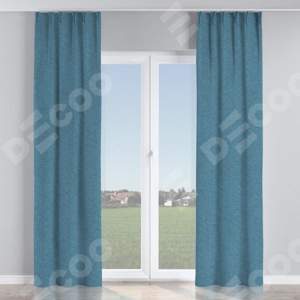 Комплект прямых штор, от производителя «Cortin», пошиты из ткани твид блэкаут светло-синий, артикул ткани 90935. С изнаночной стороны в верхней части штор пристрачивается шторная лента с декоративными складками «Кустик». Для создания элегантных складок прямые шторы шьются по стандарту с коэффициентом 1:2 (на 100 см. ширины проёма 200 см. ширины ткани).