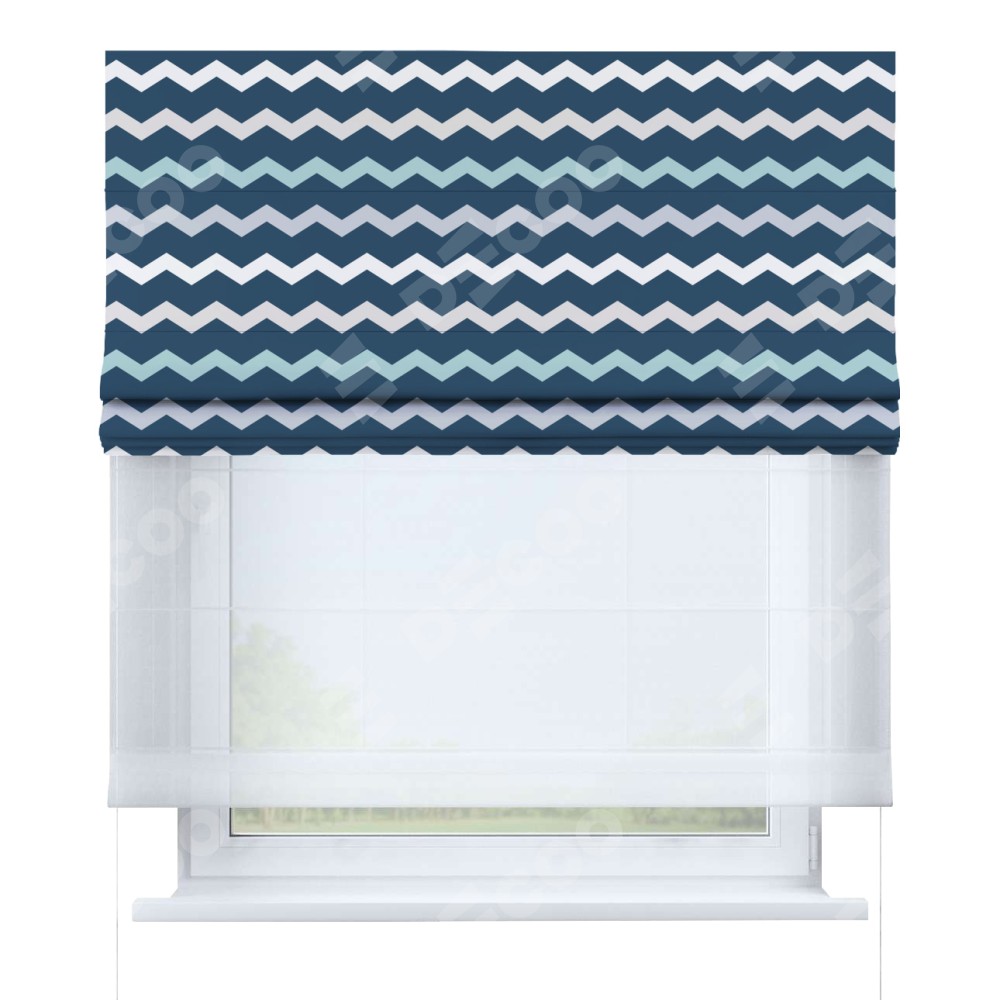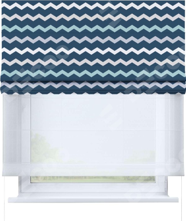 Римская штора день-ночь производителя «Cortin», используется для проёма, пошита из двух полотен, с лицевой блэкаут с нанесением сублимационной печати «Морской шеврон», вторая ткань тюль (по стандарту комплектуется тюль белого цвета артикул V-01). Имеет универсальный механизм и подходит для монтажа: на потолок, на стену и в нишу.