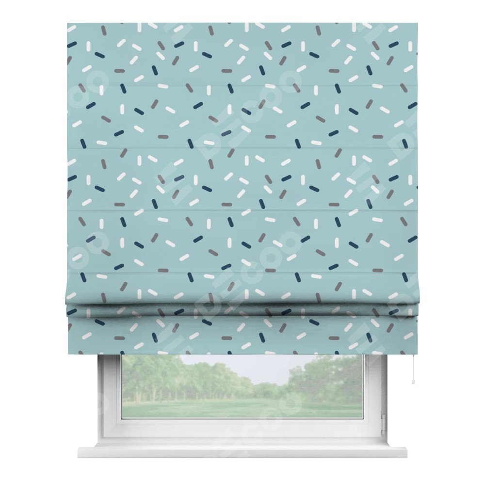 Римская штора производителя «Cortin», используется для проёма, пошита из ткани блэкаут с нанесением сублимационной печати «Короткие линии». Имеет универсальный механизм и подходит для монтажа: на потолок, на стену и в нишу.