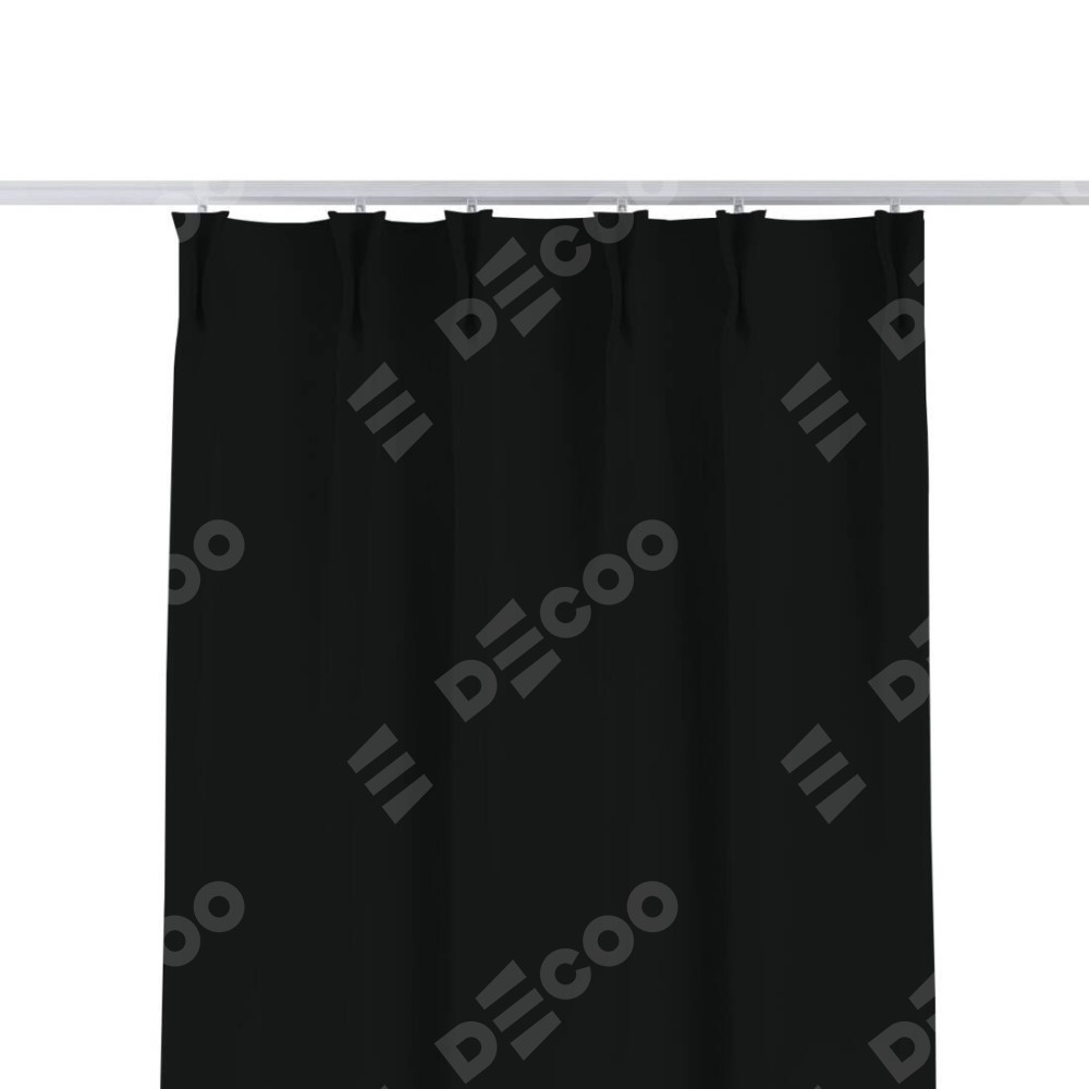 Комплект прямых штор, от производителя «Cortin», пошиты из ткани блэкаут однотонный черный, артикул ткани 91571−2. С изнаночной стороны в верхней части штор пристрачивается шторная лента с декоративными складками «Кустик». Для создания элегантных складок прямые шторы шьются по стандарту с коэффициентом 1:2 (на 100 см. ширины проёма 200 см. ширины ткани).