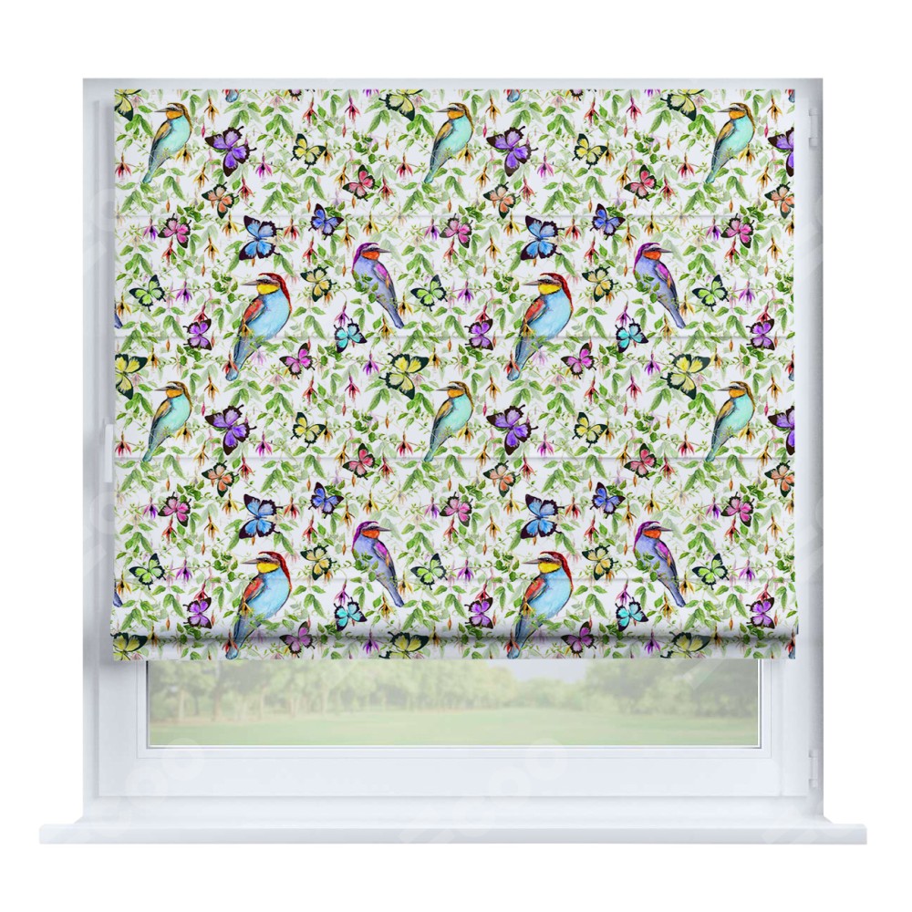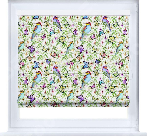 Римская штора производителя «Cortin», устанавливается на створку окна, пошита из ткани блэкаут с нанесением сублимационной печати «Тропические птицы». Штора шьётся по индивидуальным размерам, для данного типа римской шторы возможная ширина от 35 до 150 см., высота до 250 см.