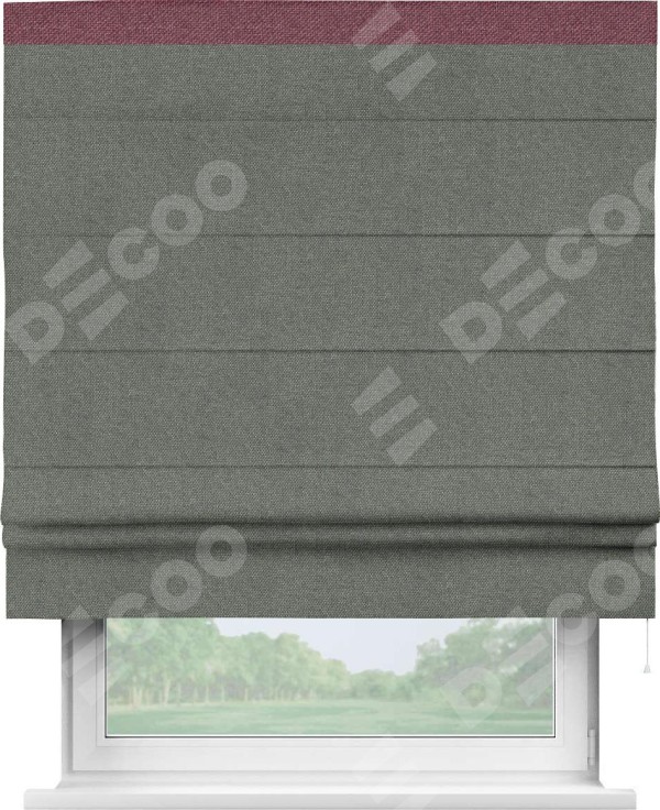 Римская штора производителя «Cortin», используется для проёма, пошита из ткани лён димаут тёмно-серый, артикул 91011. Отделка шторы кантом «Кинг», ткань для канта используется из льна димаут разной расцветки на выбор. Имеет универсальный механизм и подходит для монтажа: на потолок, на стену и в нишу.