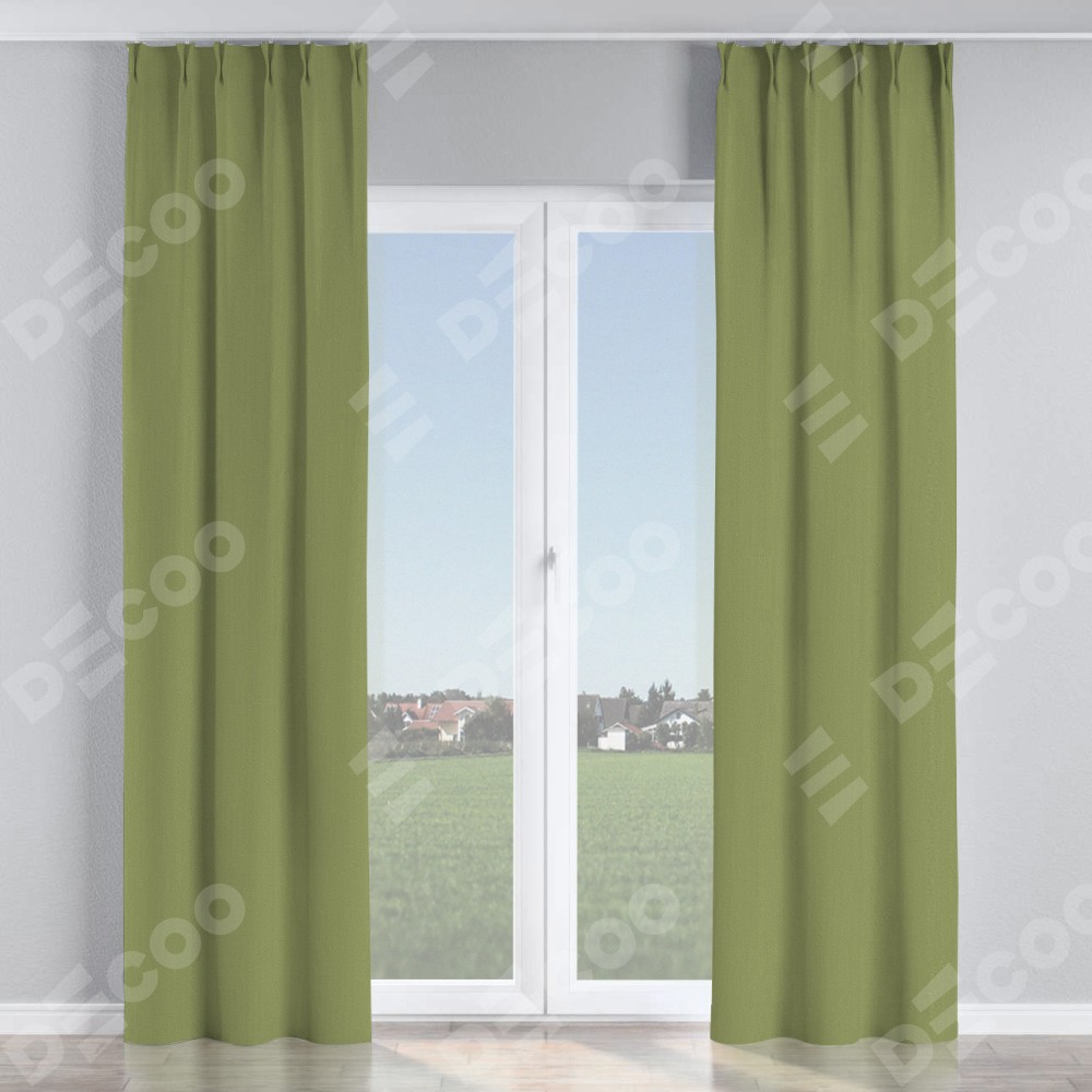 Комплект прямых штор, от производителя «Cortin», пошиты из ткани бархат золотая оливка, артикул ткани 90725. С изнаночной стороны в верхней части штор пристрачивается шторная лента с декоративными складками «Кустик». Для создания элегантных складок прямые шторы шьются по стандарту с коэффициентом 1:2 (на 100 см. ширины проёма 200 см. ширины ткани).