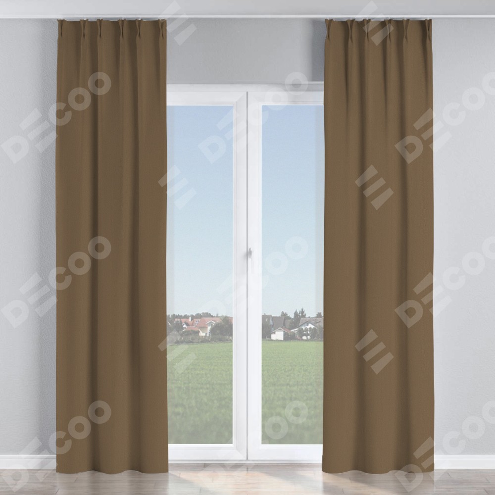 Комплект прямых штор, от производителя «Cortin», пошиты из ткани блэкаут однотонный коричневый, артикул ткани 91334. С изнаночной стороны в верхней части штор пристрачивается шторная лента с декоративными складками «Кустик». Для создания элегантных складок прямые шторы шьются по стандарту с коэффициентом 1:2 (на 100 см. ширины проёма 200 см. ширины ткани).