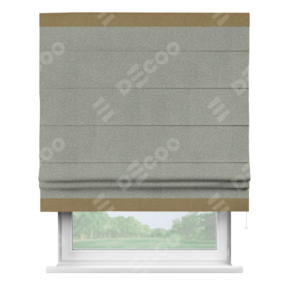 Римская штора производителя «Cortin», используется для проёма, пошита из ткани лён димаут серый, артикул 91009. Отделка шторы кантом «Горизонт», ткань для канта используется из льна димаут разной расцветки на выбор. Имеет универсальный механизм и подходит для монтажа: на потолок, на стену и в нишу.
