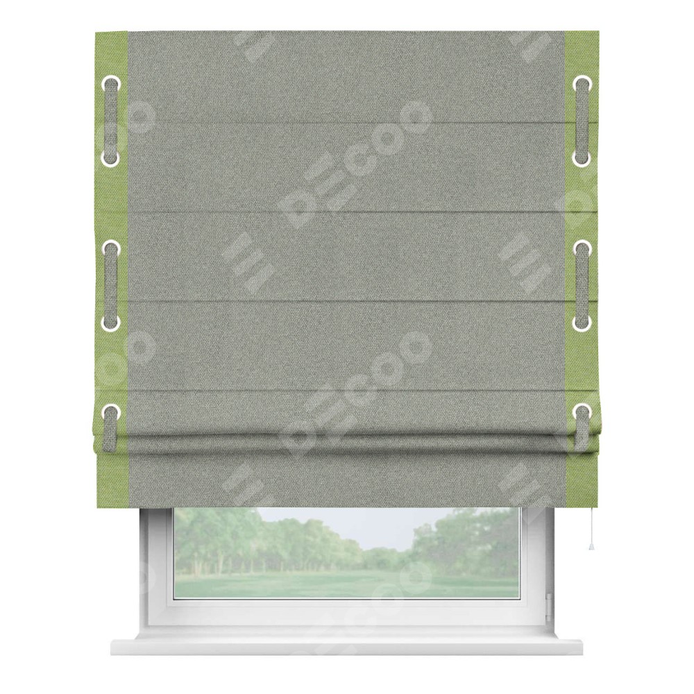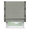 Римская штора производителя «Cortin», используется для проёма, пошита из ткани лён димаут серый, артикул 91009. Отделка шторы кантом «Стрим Дуо» на кантах расположены люверсы с пояском, ткань для канта используется лён димаут разной расцветки на выбор. Ткань для пояска обычно используется из основной ткани шторы, а так же можно сделать из любой расцветки по желанию. Имеет универсальный механизм и подходит для монтажа: на потолок, на стену и в нишу.