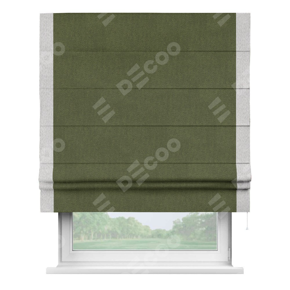 Римская штора производителя «Cortin», используется для проёма, пошита из ткани лён димаут салатовый, артикул 91002. Отделка шторы кантом «Стрим Дуо», ткань для канта используется из льна димаут разной расцветки на выбор. Имеет универсальный механизм и подходит для монтажа: на потолок, на стену и в нишу.