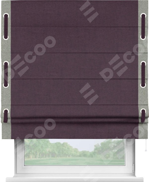 Римская штора производителя «Cortin», используется для проёма, пошита из ткани лён димаут фиолетовый, артикул 16267. Отделка шторы кантом «Стрим Дуо» на кантах расположены люверсы с пояском, ткань для канта используется лён димаут разной расцветки на выбор. Ткань для пояска обычно используется из основной ткани шторы, а так же можно сделать из любой расцветки по желанию. Имеет универсальный механизм и подходит для монтажа: на потолок, на стену и в нишу.