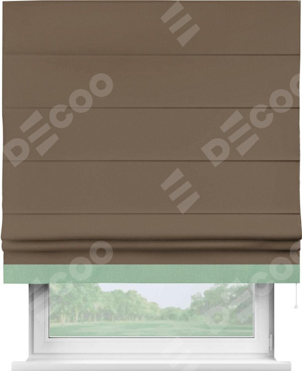 Римская штора производителя «Cortin», используется для проёма, пошита из ткани блэкаут однотонный коричневый, артикул ткани 91334. Отделка шторы кантом «Джестер», ткань для канта используется из блэкаута однотонного разной расцветки на выбор. Имеет универсальный механизм и подходит для монтажа: на потолок, на стену и в нишу.