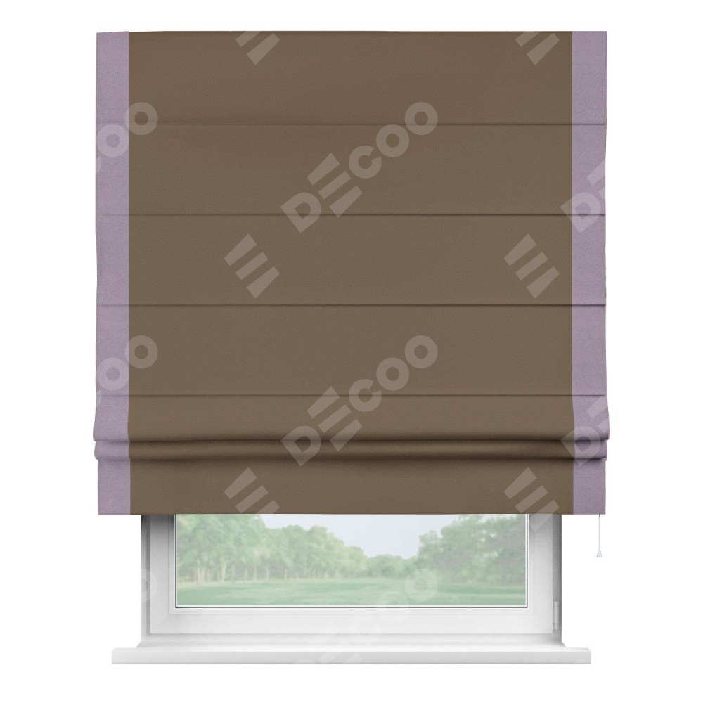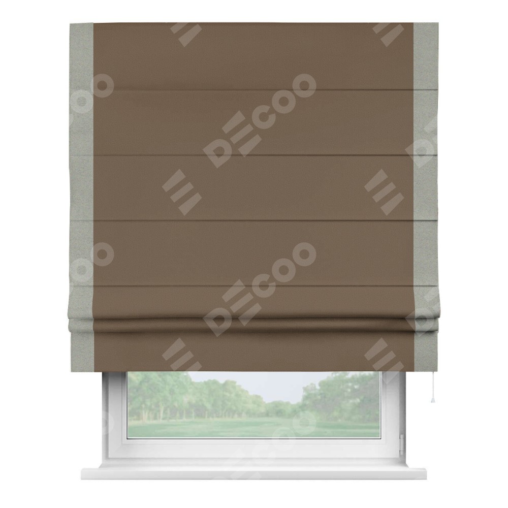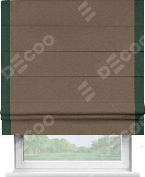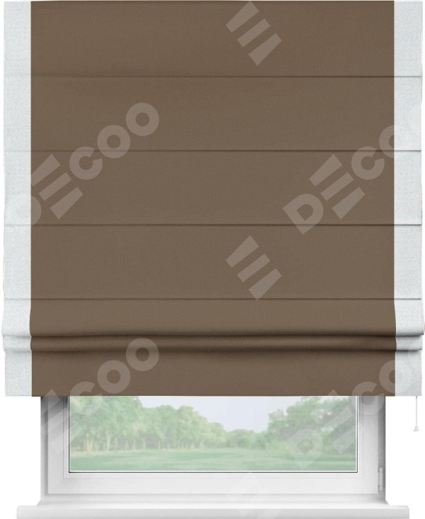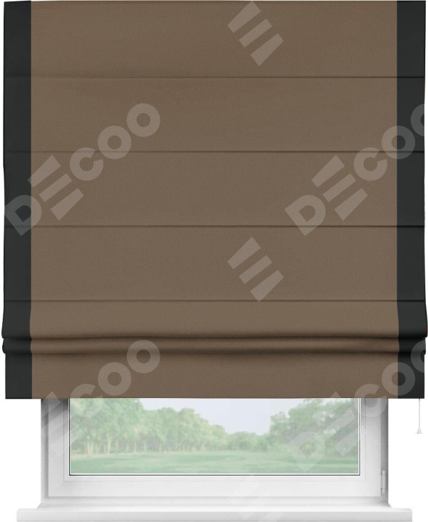 Римская штора производителя «Cortin», используется для проёма, пошита из ткани блэкаут однотонный коричневый, артикул ткани 91334. Отделка шторы кантом «Стрим Дуо», ткань для канта используется из блэкаута однотонного разной расцветки на выбор. Имеет универсальный механизм и подходит для монтажа: на потолок, на стену и в нишу.