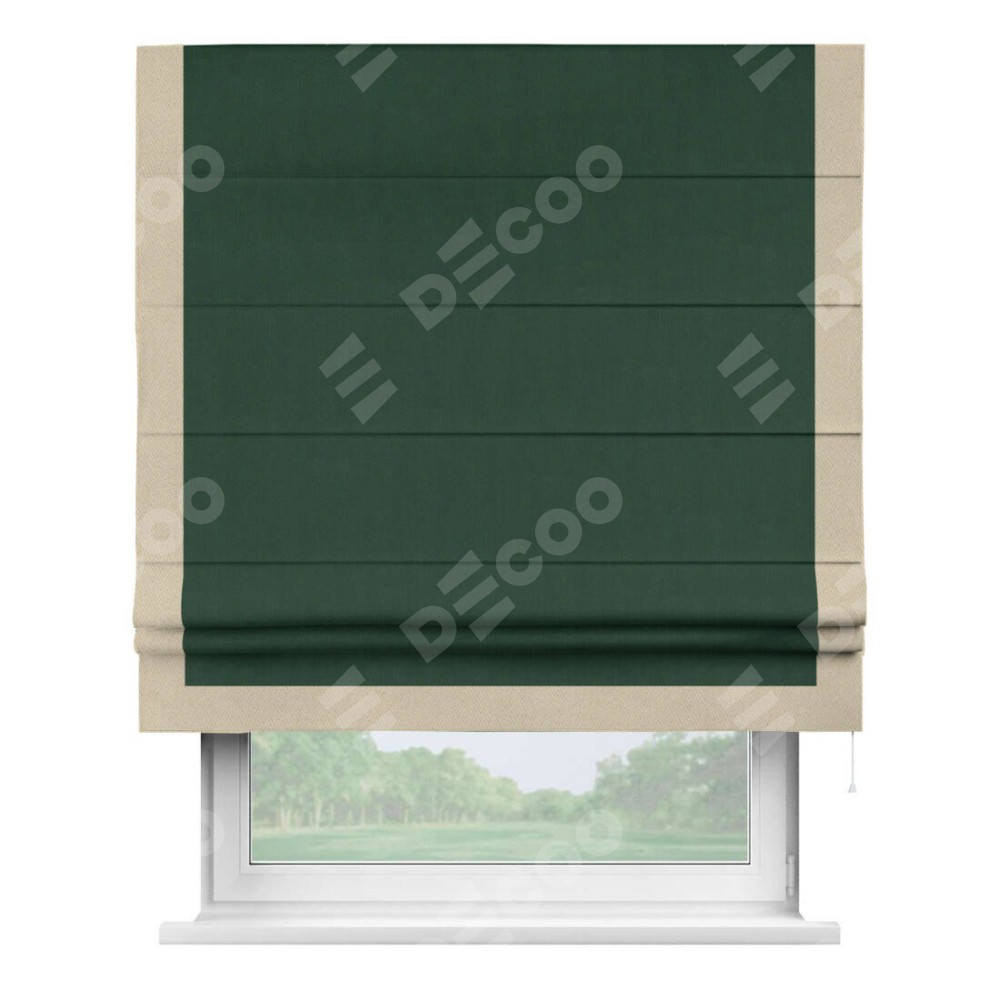 Римская штора производителя «Cortin», используется для проёма, пошита из ткани блэкаут однотонный зелёный, артикул ткани 91572−2. Отделка шторы кантом «Виктория», ткань для канта используется из блэкаута однотонного разной расцветки на выбор. Имеет универсальный механизм и подходит для монтажа: на потолок, на стену и в нишу.