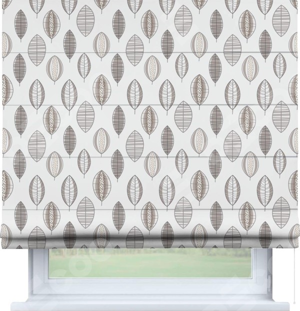 Классическая римская штора производителя «Cortin», пошита из ткани блэкаут с нанесением сублимационной печати «Кофейные листья». Имеет универсальный механизм и подходит для монтажа: на потолок, на стену и в нишу.