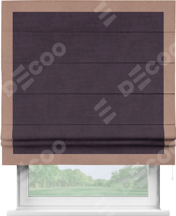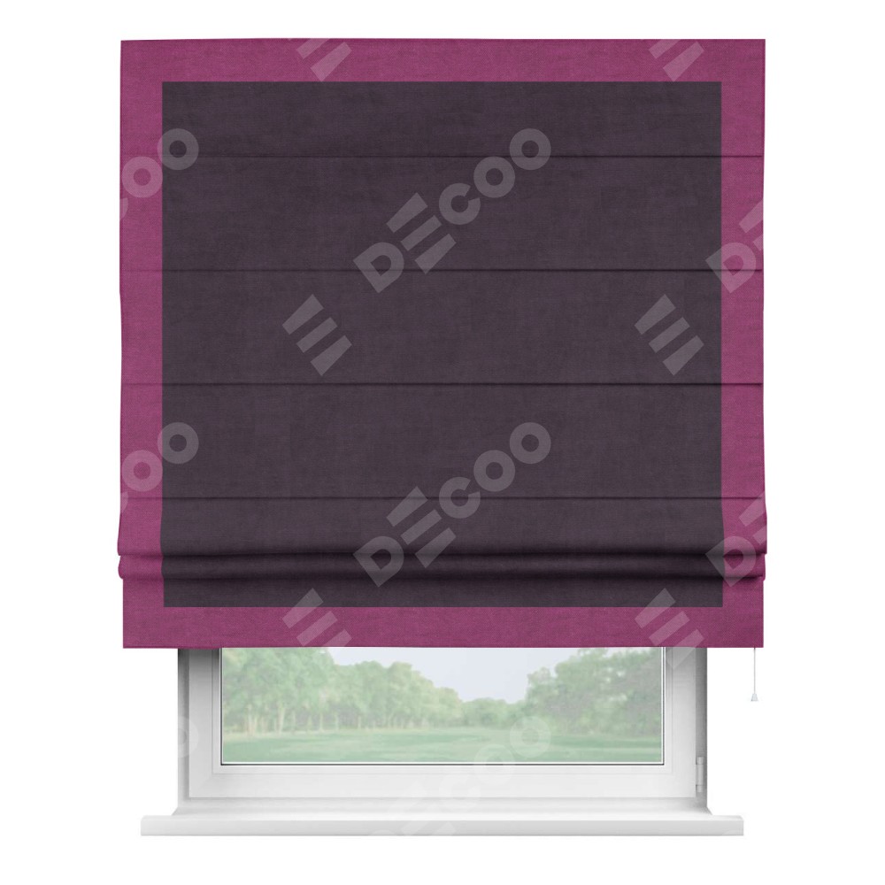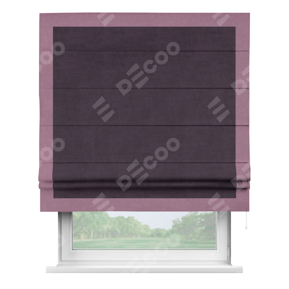 Римская штора производителя «Cortin», используется для проёма, пошита из ткани вельвет тёмно-фиолетовый, артикул ткани 72403. Отделка шторы кантом «Чесс», ткань для канта используется из вельвета разной расцветки на выбор. Имеет универсальный механизм и подходит для монтажа: на потолок, на стену и в нишу.