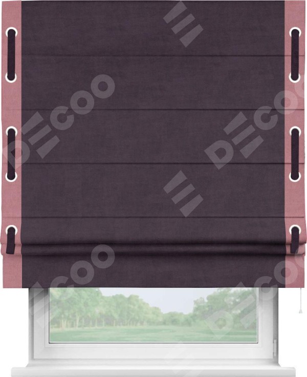 Римская штора производителя «Cortin», используется для проёма, пошита из ткани вельвет тёмно-фиолетовый, артикул ткани 72403. Отделка шторы кантом «Стрим Дуо» на кантах расположены люверсы с пояском, ткань для канта используется из вельвета разной расцветки на выбор. Ткань для пояска обычно используется из основной ткани шторы, а так же можно сделать из любой расцветки по желанию. Имеет универсальный механизм и подходит для монтажа: на потолок, на стену и в нишу.