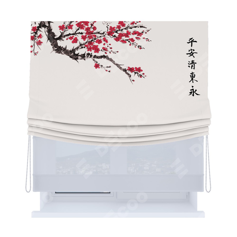 Римская штора день-ночь производителя «Cortin», используется для проёма, пошита из двух полотен, с лицевой блэкаут с нанесением сублимационной печати «Цветущая сакура», вторая ткань тюль (по стандарту комплектуется тюль белого цвета артикул V-01). Имеет универсальный механизм и подходит для монтажа: на потолок, на стену и в нишу. Удобное управление каждой шторой отдельно.