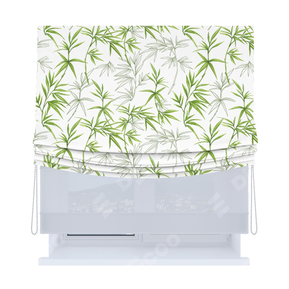 Римская штора день-ночь производителя «Cortin», используется для проёма, пошита из двух полотен, с лицевой блэкаут с нанесением сублимационной печати «Зелёный бамбук», вторая ткань тюль (по стандарту комплектуется тюль белого цвета артикул V-01). Имеет универсальный механизм и подходит для монтажа: на потолок, на стену и в нишу. Удобное управление каждой шторой отдельно.