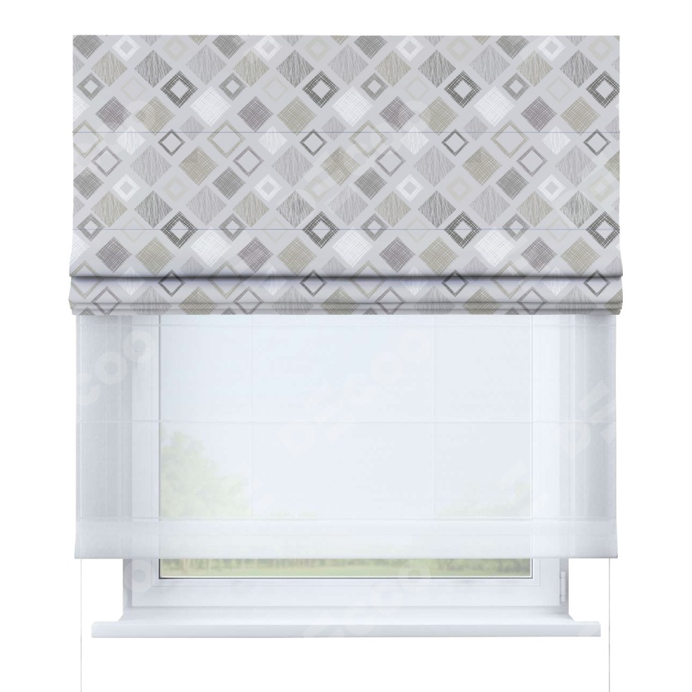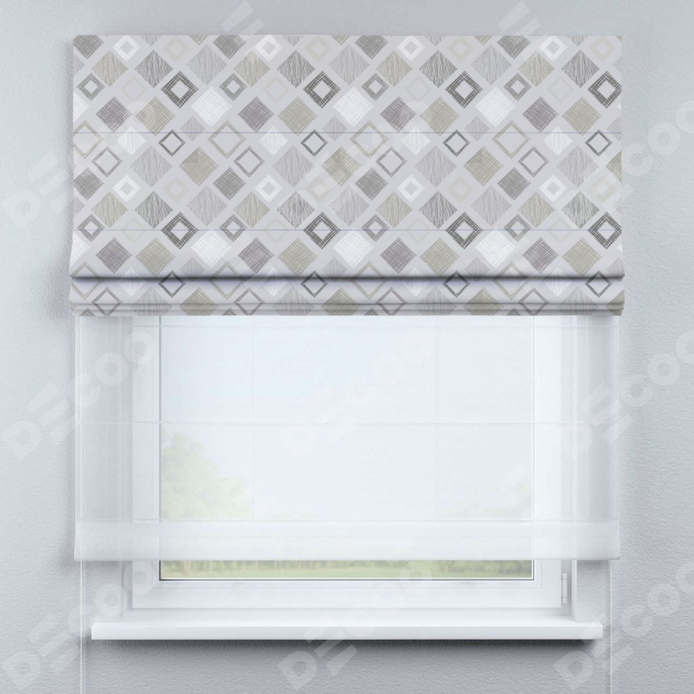 Двойная римская штора «День-ночь» от производителя Cortin предназначена для использования в проёмах. Эта штора уникальна тем, что состоит из двух полотен. На лицевой стороне находится блэкаут с нанесением сублимационной печати «Квадро», обеспечивающий эффективное затемнение. В комплект также входит вторая ткань — легкий белый тюль (артикул: V-01), который добавляет изящества и легкости оформлению окна. Кроме того, доступны и другие разновидности ткани тюль, выбор которых доступен по  ссылке .