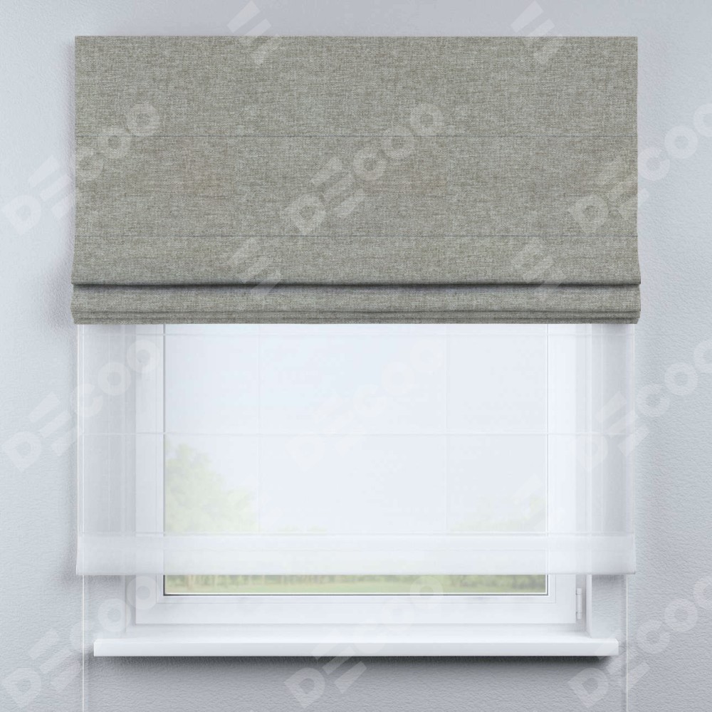 Римская штора день-ночь производителя «Cortin», используется для проёма, пошита из двух полотен, с лицевой стороны лён кашемир серый артикул 17208, вторая ткань тюль (по стандарту комплектуется тюль белого цвета артикул V-01). Имеет универсальный механизм и подходит для монтажа: на потолок, на стену и в нишу.