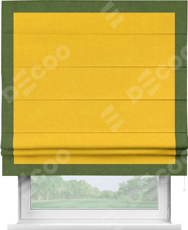 Римская штора производителя «Cortin», используется для проёма, пошита из ткани канвас желтый, артикул ткани v-344. Отделка шторы кантом «Чесс» (трава v-473), ткань для канта используется из канваса разной расцветки на выбор. Имеет универсальный механизм и подходит для монтажа: на потолок, на стену и в нишу.