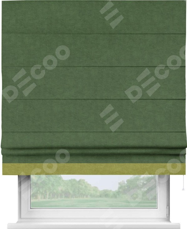 Римская штора производителя «Cortin», используется для проёма, пошита из ткани канвас зелёный, артикул ткани v-16. Отделка шторы кантом «Джестер» (зелёное яблоко v-370), ткань для канта используется из канваса разной расцветки на выбор. Имеет универсальный механизм и подходит для монтажа: на потолок, на стену и в нишу.
