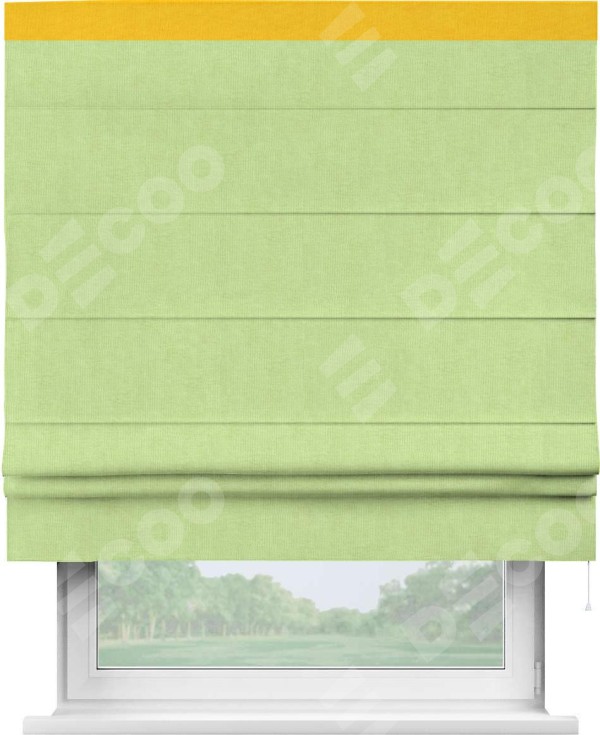 Римская штора производителя «Cortin», используется для проёма, пошита из ткани канвас липовый, артикул ткани v-207. Отделка шторы кантом «Кинг» (желтый v-344), ткань для канта используется из канваса разной расцветки на выбор. Имеет универсальный механизм и подходит для монтажа: на потолок, на стену и в нишу.