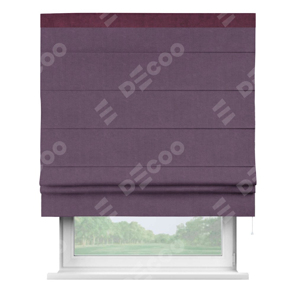 Римская штора производителя «Cortin», используется для проёма, пошита из ткани канвас сиреневый, артикул ткани v-98. Отделка шторы кантом «Кинг» (фиолетовый v-99), ткань для канта используется из канваса разной расцветки на выбор. Имеет универсальный механизм и подходит для монтажа: на потолок, на стену и в нишу.