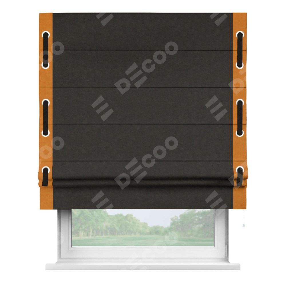 Римская штора производителя «Cortin», используется для проёма, пошита из ткани канвас тёмно-коричневый, артикул ткани v-13. Отделка шторы кантом «Стрим Дуо» (оранжевый v-106) на кантах расположены люверсы с пояском, ткань для канта используется из канваса разной расцветки на выбор. Ткань для пояска обычно используется из основной ткани шторы, а так же можно сделать из любой расцветки по желанию. Имеет универсальный механизм и подходит для монтажа: на потолок, на стену и в нишу.