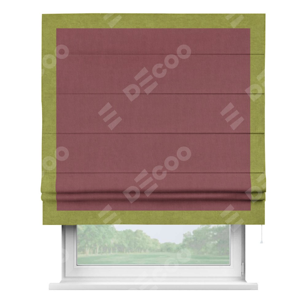Римская штора производителя «Cortin», используется для проёма, пошита из ткани канвас ягодный, артикул ткани v-28. Отделка шторы кантом «Чесс» (зелёное яблоко v-370), ткань для канта используется из канваса разной расцветки на выбор. Имеет универсальный механизм и подходит для монтажа: на потолок, на стену и в нишу.
