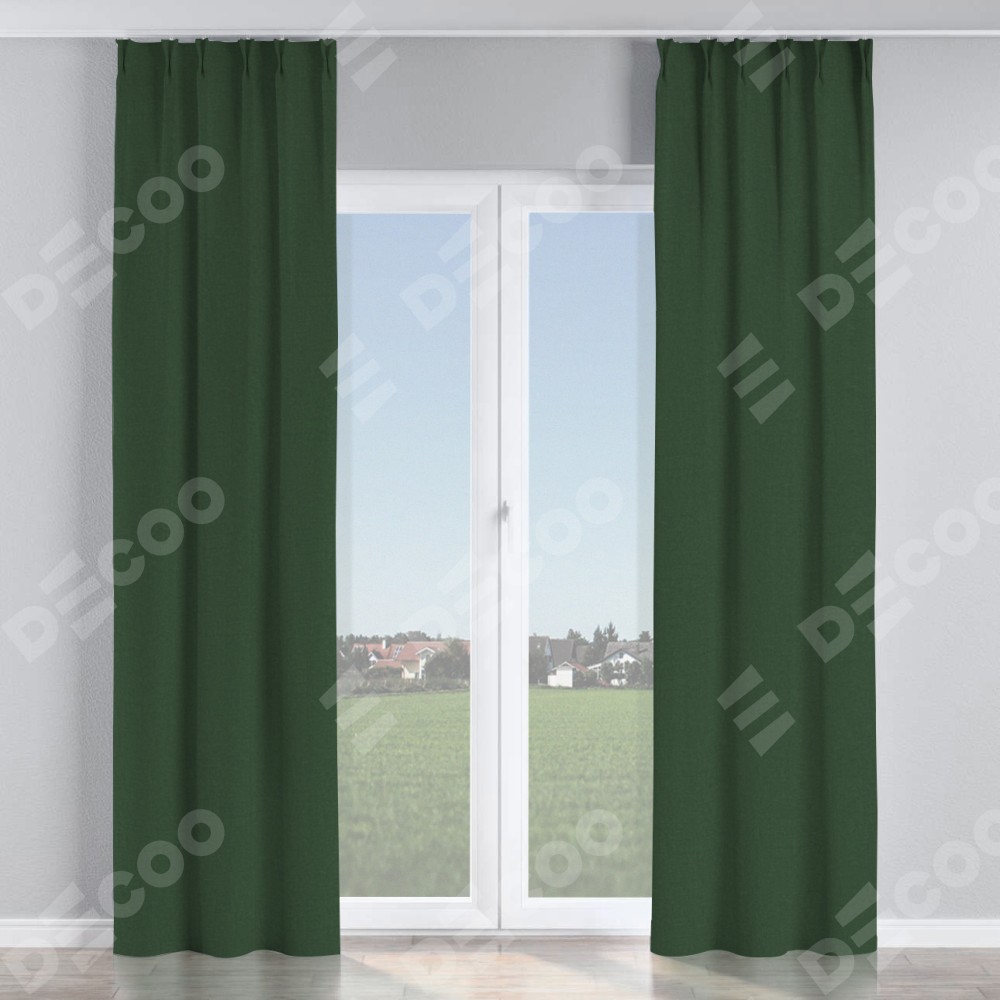 Комплект прямых штор, от производителя «Cortin», пошиты из ткани канвас глубокий зелёный, артикул ткани v-588. С изнаночной стороны в верхней части штор пристрачивается шторная лента с декоративными складками «Кустик». Для создания элегантных складок прямые шторы шьются по стандарту с коэффициентом 1:2 (на 100 см. ширины проёма 200 см. ширины ткани).
