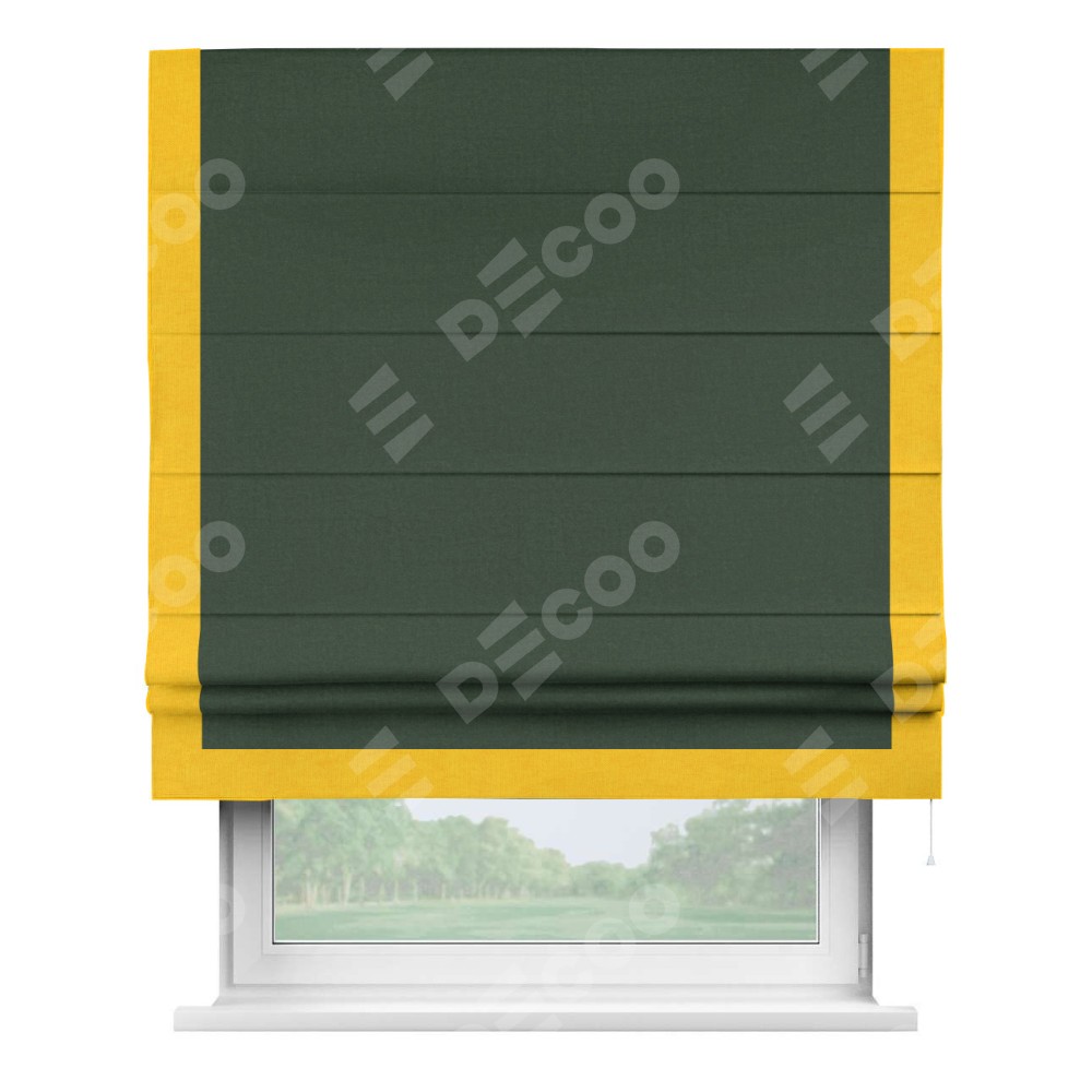 Римская штора производителя «Cortin», используется для проёма, пошита из ткани канвас глубокий зелёный, артикул ткани v-588. Отделка шторы кантом «Виктория» (желтый v-344), ткань для канта используется из канваса разной расцветки на выбор. Имеет универсальный механизм и подходит для монтажа: на потолок, на стену и в нишу.