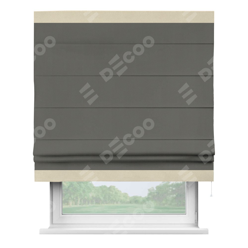 Римская штора производителя «Cortin», используется для проёма, пошита из ткани блэкаут однотонный тёмно-серый, артикул ткани 91570. Отделка шторы кантом «Горизонт», ткань для канта используется из блэкаута однотонного разной расцветки на выбор. Имеет универсальный механизм и подходит для монтажа: на потолок, на стену и в нишу.