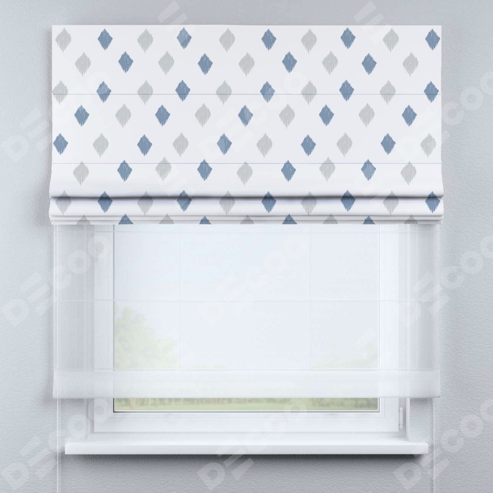 Двойная римская штора «День-ночь» от производителя Cortin предназначена для использования в проёмах. Эта штора уникальна тем, что состоит из двух полотен. На лицевой стороне находится блэкаут с нанесением сублимационной печати «Икат ромбики», обеспечивающий эффективное затемнение. В комплект также входит вторая ткань — легкий белый тюль (артикул: V-01), который добавляет изящества и легкости оформлению окна. Кроме того, доступны и другие разновидности ткани тюль, выбор которых доступен по ссылке .