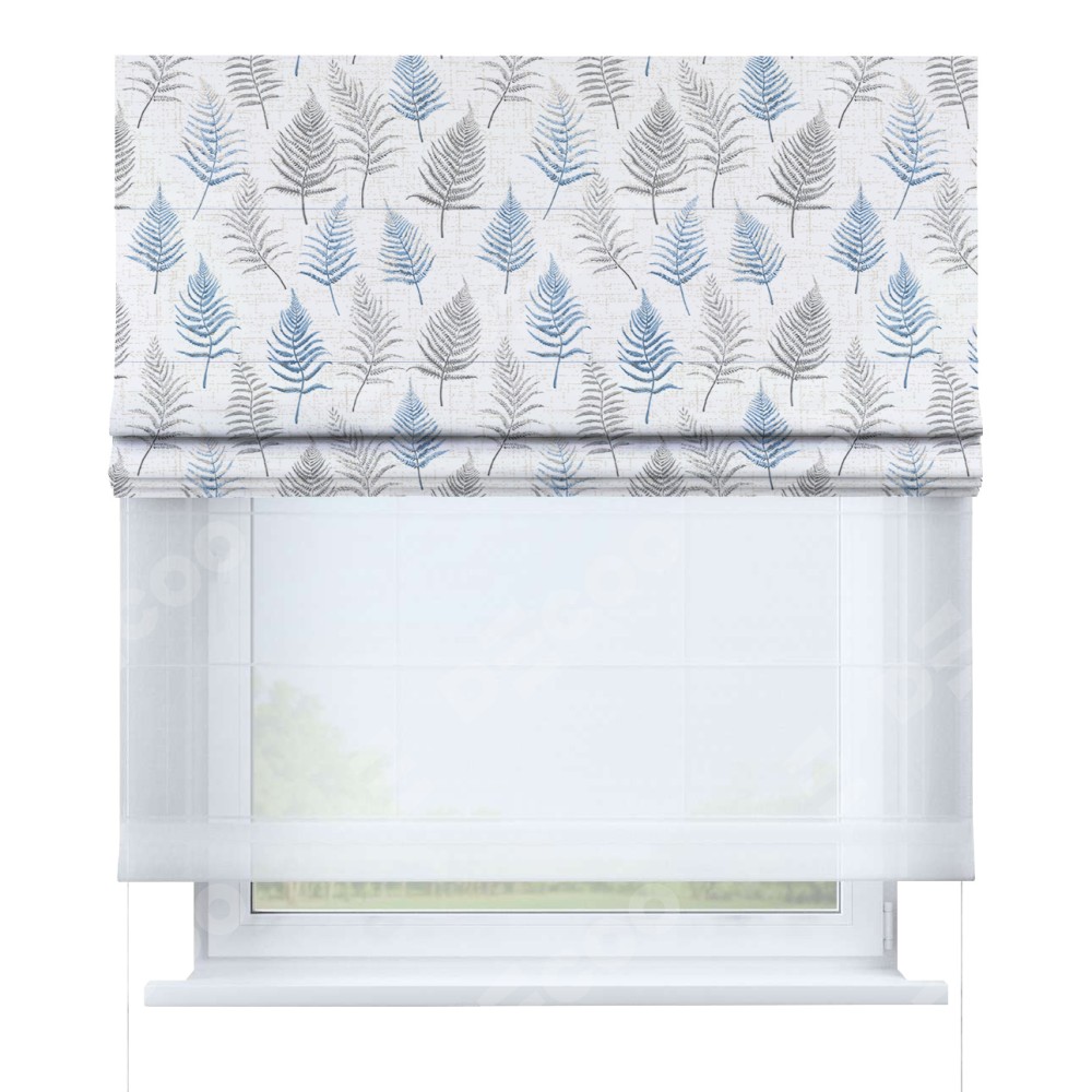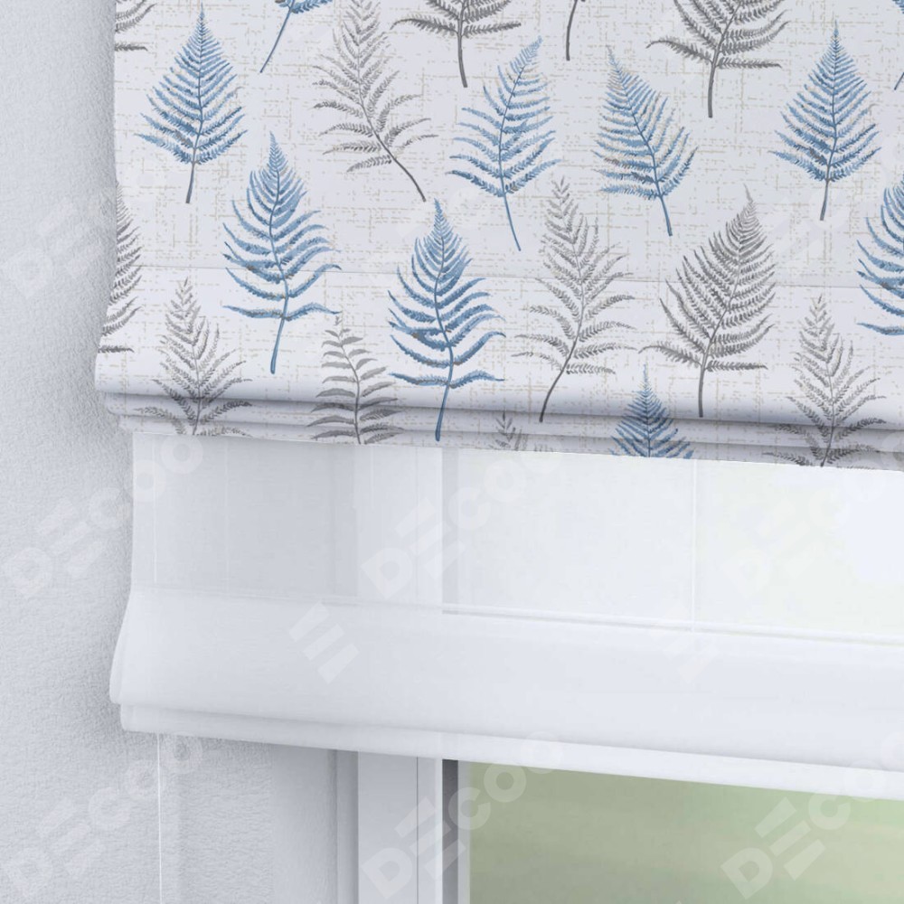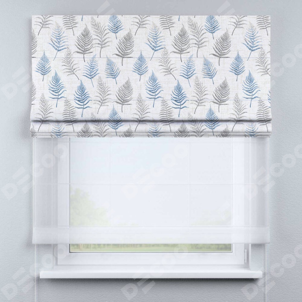 Двойная римская штора «День-ночь» от производителя Cortin предназначена для использования в проёмах. Эта штора уникальна тем, что состоит из двух полотен. На лицевой стороне находится блэкаут с нанесением сублимационной печати «Королевский папоротник», обеспечивающий эффективное затемнение. В комплект также входит вторая ткань — легкий белый тюль (артикул: V-01), который добавляет изящества и легкости оформлению окна. Кроме того, доступны и другие разновидности ткани тюль, выбор которых доступен по  ссылке .