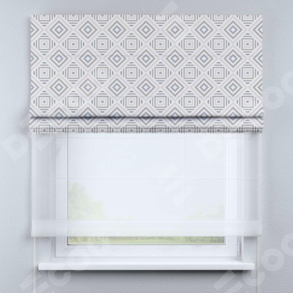 Двойная римская штора «День-ночь» от производителя Cortin предназначена для использования в проёмах. Эта штора уникальна тем, что состоит из двух полотен. На лицевой стороне находится блэкаут с нанесением сублимационной печати «Техно серый», обеспечивающий эффективное затемнение. В комплект также входит вторая ткань — легкий белый тюль (артикул: V-01), который добавляет изящества и легкости оформлению окна. Кроме того, доступны и другие разновидности ткани тюль, выбор которых доступен по  ссылке .
