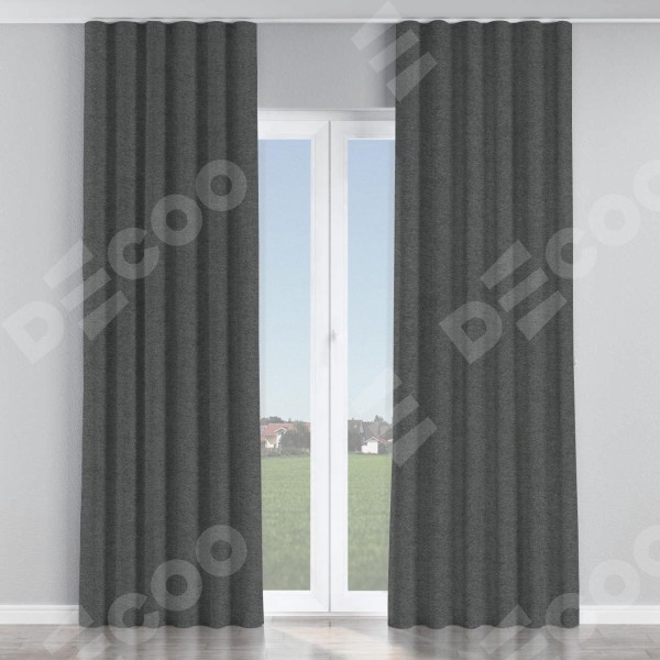 Комплект прямых штор, от производителя «Cortin», пошиты из ткани твид блэкаут тёмно-серый, артикул ткани 90938. С изнаночной стороны в верхней части штор пристрачивается шторная лента с декоративными складками «Волна». Для создания элегантных складок прямые шторы шьются по стандарту с коэффициентом 1:2 (на 100 см. ширины проёма 200 см. ширины ткани).
