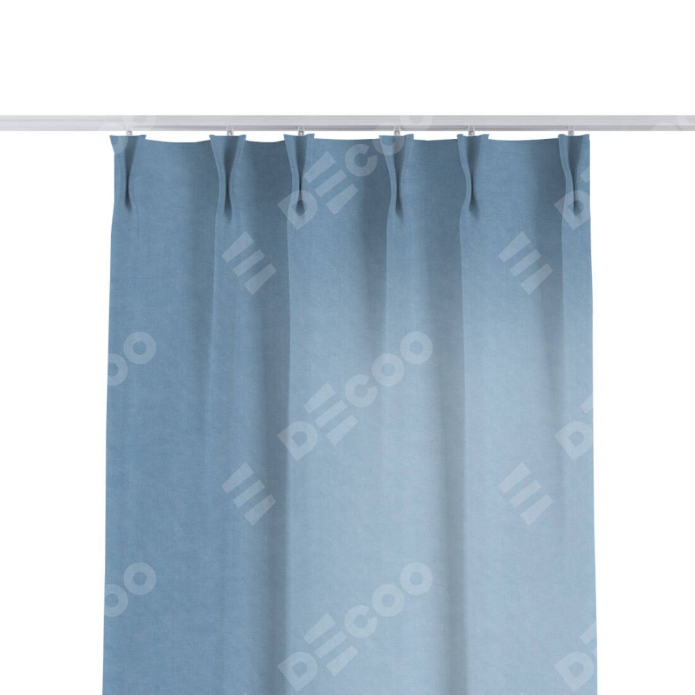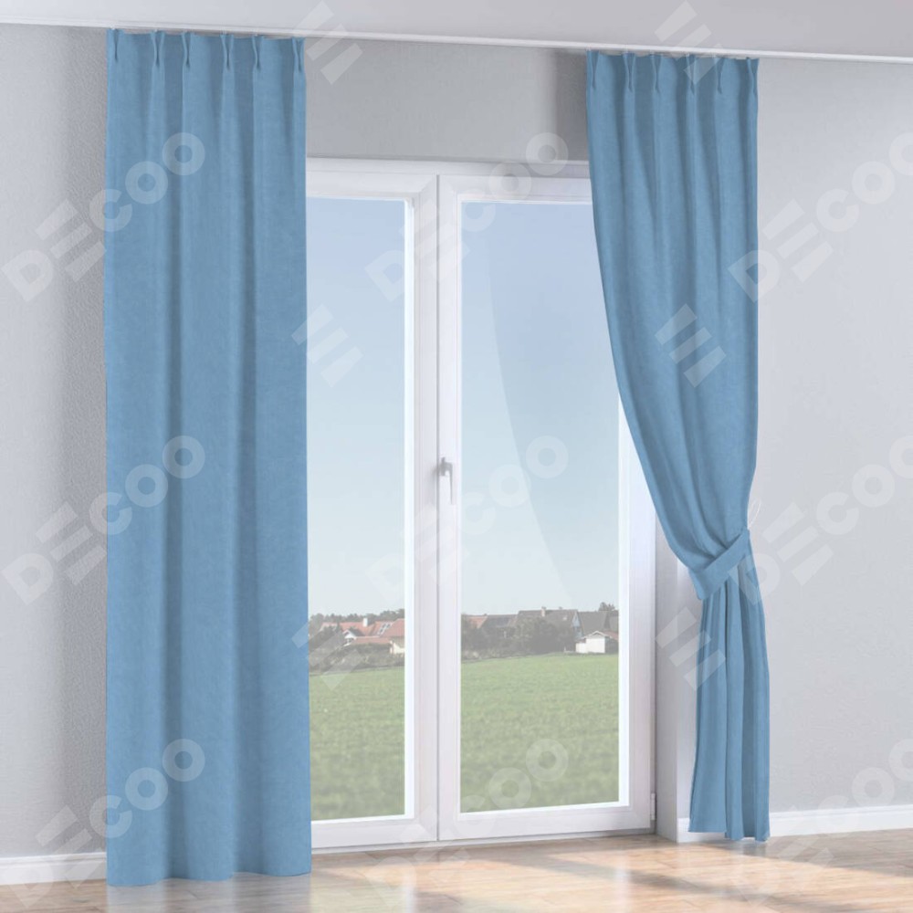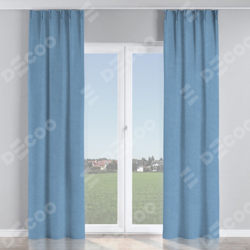 Комплект прямых штор, от производителя «Cortin», пошиты из ткани канвас голубой, артикул ткани 92729. С изнаночной стороны в верхней части штор пристрачивается шторная лента с декоративными складками «Кустик». Для создания элегантных складок прямые шторы шьются по стандарту с коэффициентом 1:2 (на 100 см. ширины проёма 200 см. ширины ткани).