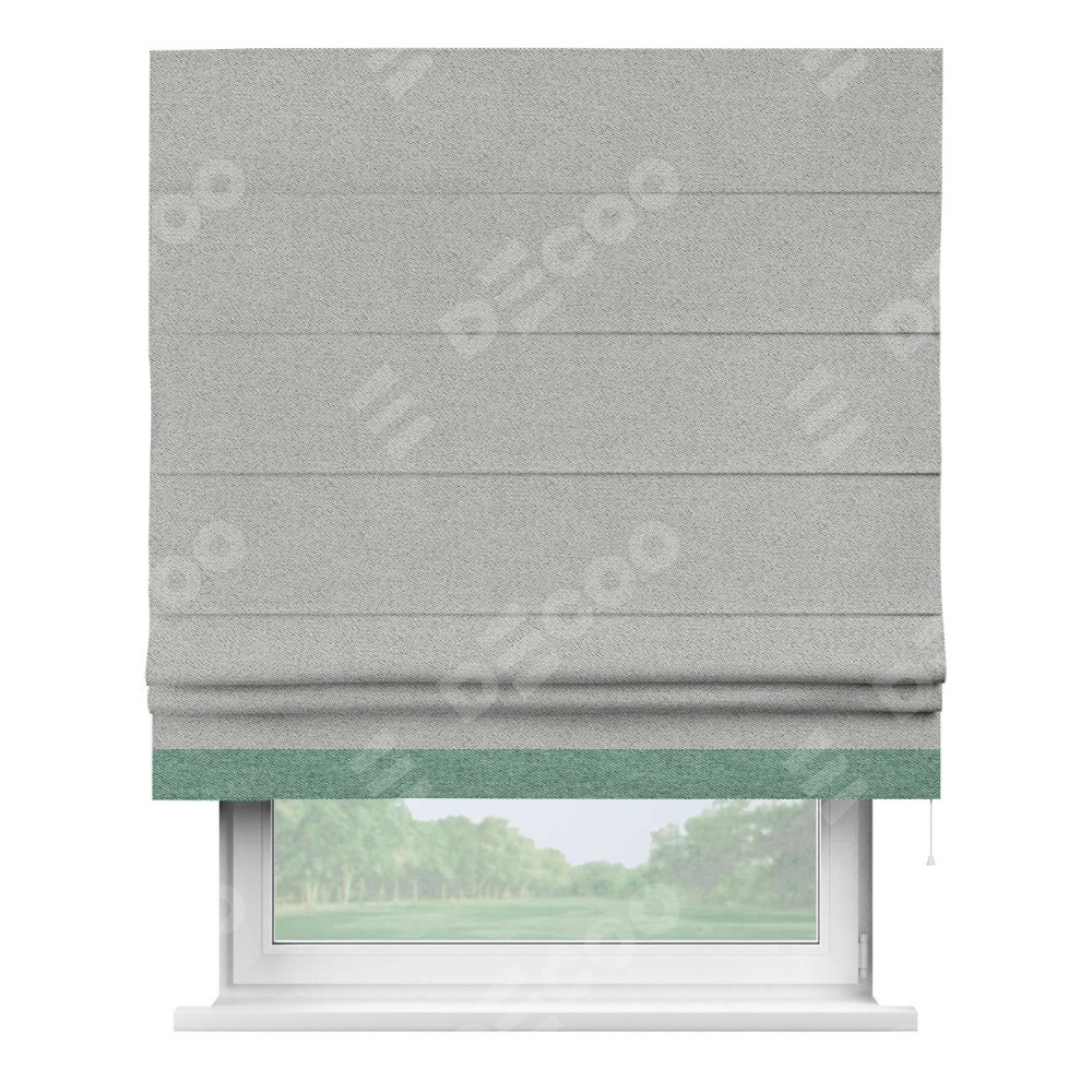 Римская штора производителя «Cortin», используется для проёма, пошита из ткани твид блэкаут светло-серый, артикул 90936. Отделка шторы кантом «Джестер», ткань для канта используется из твида разной расцветки на выбор. Имеет универсальный механизм и подходит для монтажа: на потолок, на стену и в нишу.